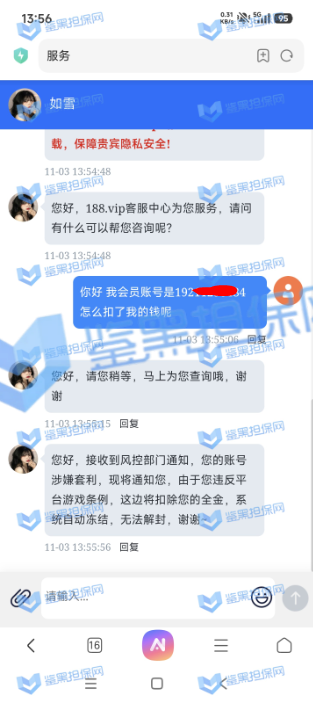 2、鉴黑担保网联系该平台相关负责人核实情况,对方表示该会员存在一倍流水套利的情况,领取彩金之后迅速一倍水提款,且在彩票游戏存在异常投注行为,维权专员让其提供套利行为的各项资讯进行复查,对方无法提供并且表示非优质套利用户移步其他地方,本金也拒绝退回。