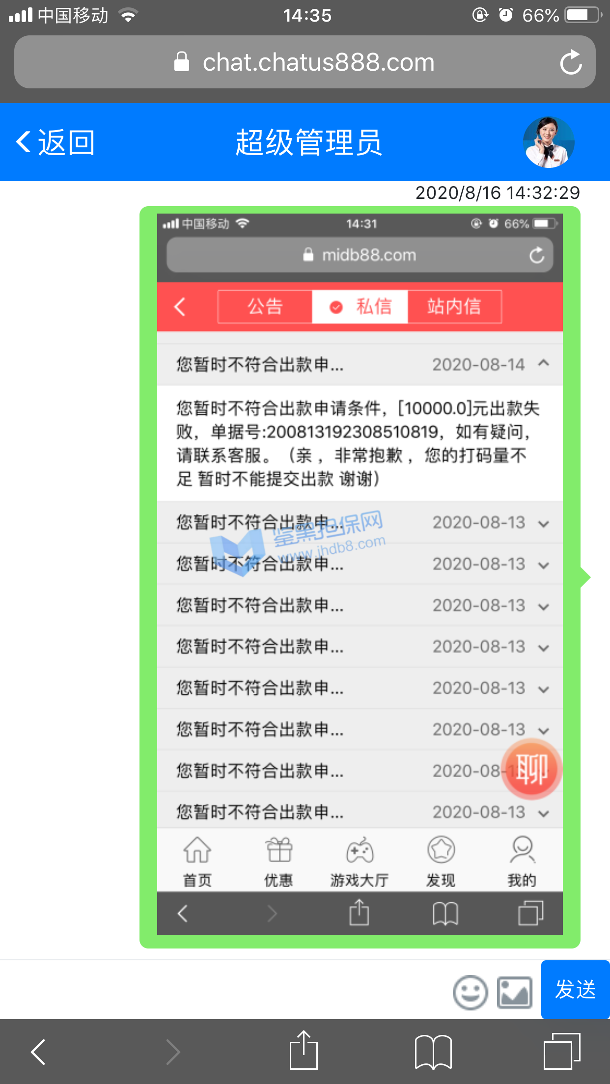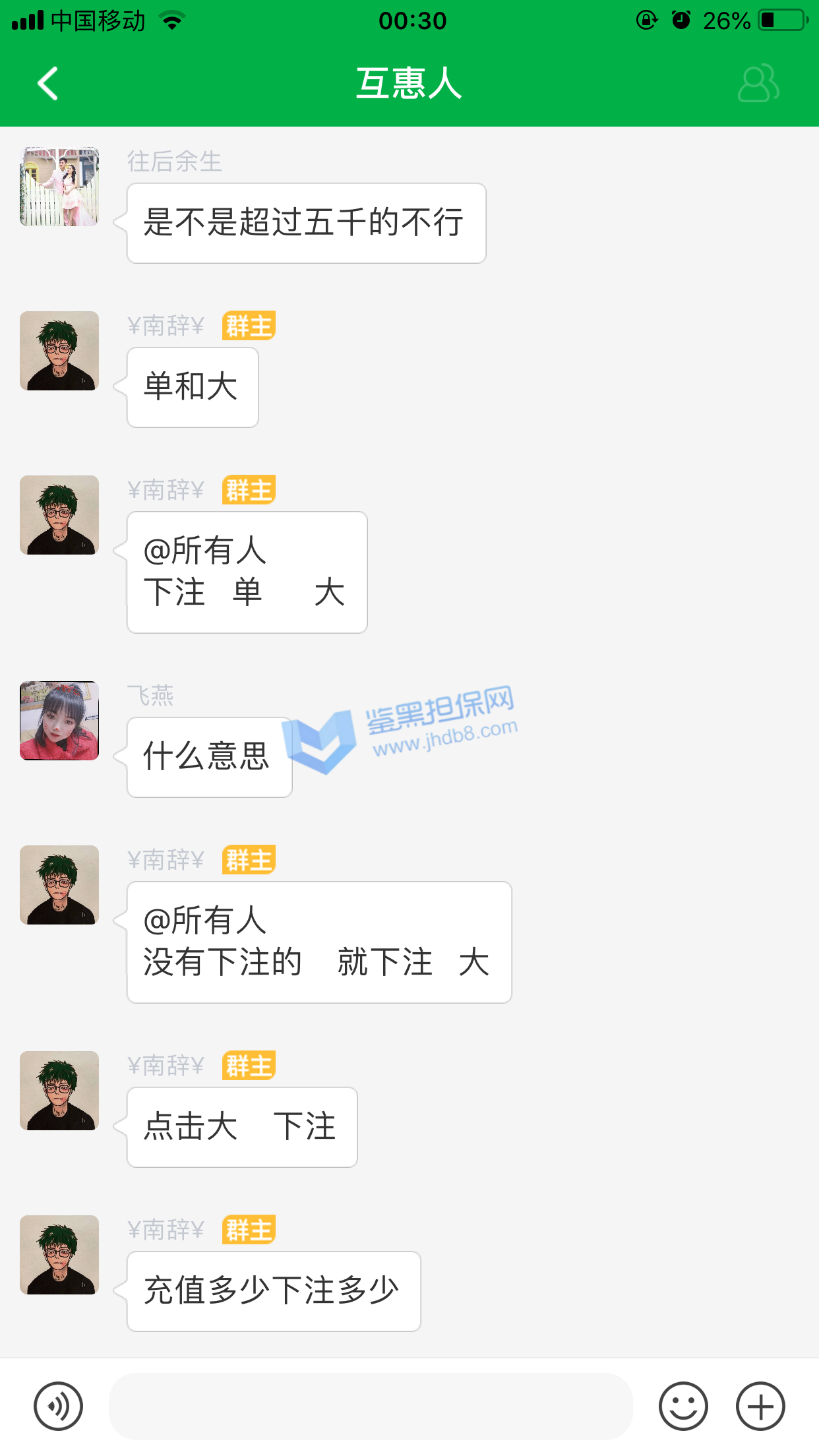 我2020年8月2日被拉进一个掌嗨群,群名叫《互惠人—初级》,群里包含群主一共有4个管理员带着我们在一个名叫《米多宝》的衔接网站下注5分快3,除开管理员,群里人数最多的时候有119个人左右,一天可以操作3次,操作时间分别为下午1点,下午5点,晚上9点,操作时间偶尔会有变动,管理员让我们怎么操作我们就怎么操作、其中我的管理员是群主,8.2号—8.5号我按照群主说的操作一共赢了1500元左右,8.6号群主说有福利数据,充值多少赚多少,赚钱之后分红一半给他们公司,当时说的名额一共有36个,直到8.6号晚上7点半了才操作完几个,剩下的全被拉进一个小群,群名叫《互惠人》,群里包含群主和管理员一共有29个人,除开群主和管理员有27个人,群主让我们一起按照他说的操作,我按照他说的操作了,结果没有中奖,输了1万,而且群里所有人都没中奖,8.7号—8.10号我又按照群主说的操作一共赢了2200左右,8.11号群主又说有福利数据,充值多少赚多少,我又充值了一万进去,心想着多赢点,把8.6号亏损的赚回来,充值成功之后群主又说让我先转6000分红给他他才带我操作,我没钱了没转给他他就没带我操作,后来我说我不做了,我想把本金提现出来,群主说必须要按照他说的操作,完成打码量之后才能提现,问米多宝客服也是说必须要完成打码量之后才能提交出款,耗了一个多小时,群主又说只有等第二天操作普通数据之后才能把1万本金提现了,第二天上午11点左右我进掌嗨群一看,群就被解散了,我去问群主,群主说的没事的,等公司给他新群和新数据之后就可以进新群操作了,最迟当天晚上或者第二天就会有新群和新数据,我慌了就反复多问了他一下,他就不是很耐烦了,然后从他回复我的信息里我就看出来以后不会有什么新群和新数据了,后来直到现在我联系他,他都没回我信息,偶尔回复一下也是说只有让我先转6千给他,他才带我操作的那种数据,就这样我一共被骗了16300元。希望鉴黑担保网帮帮我,这是急用钱。