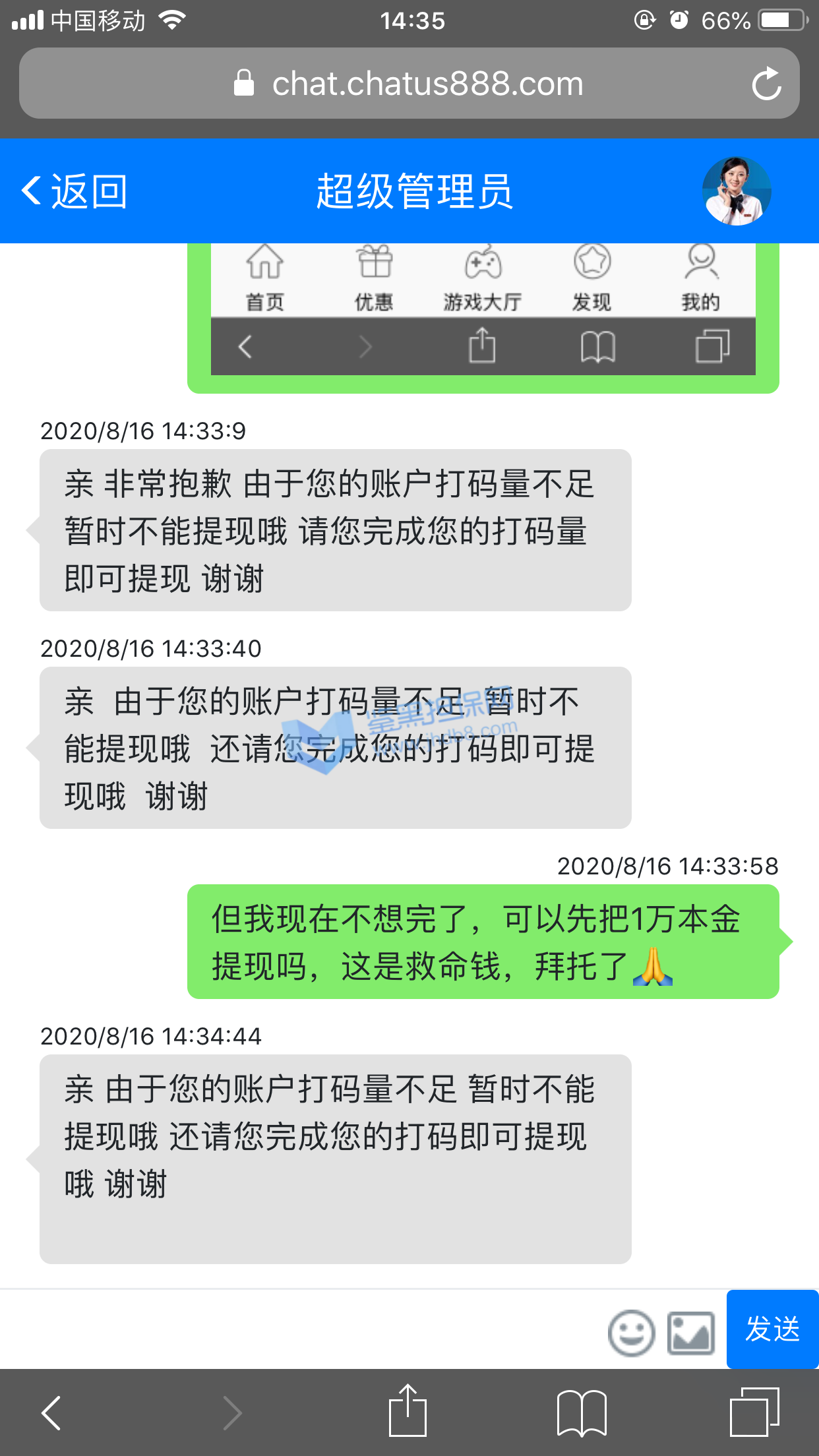 我之前在幸运彩票平台充值2000,打码赢到2800想要提现,但是提现未到账,联系导师以最近风控较严,投注违规为由不给出款,第二天提款金额返回到账户,但是要打50倍流水才能提现,我又投注了几天,提现需要的流水又增加了两倍,需要27万多才可以提现,联系导师说是可以做全码的包赚方案,还可以清除27万流水,我再三和导师确认是不是只要充值五万就可以做包赚方案清除流水然后提现,导师很肯定的回答是,我就贷款充值了五万,充值成功十多分钟后,导师说是我的账号被系统自动升级成十万的方案,要我在24小时之内完成再充值五万做十万的方案,否则就会封号,还要交违约金才能解封,我当时因为之前的五万都是贷款的,也没有什么钱充值,导师就叫我和朋友借,说是只要再充值五万做完方案就能全部提现。第二天导师和我说有多少先充值多少,她和主管求情帮我延期,我因为害怕被封号交违约金,第二天和朋友借了10000充值进去,第三天又是想同的理由又充值了6000,后面实在没钱了就没在充值,第五天他们就冻结了我的账号,不能登录,我和导师说我实在没钱在充值了,导师回复我说叫我再想想办法,她做担保把我的账号先解封了,要让我充值满十万做全码活动,否则账户里面的钱就要清零。现在我充进去的钱也不能提现,里面的钱全部都是贷款和借的,我希望能提出充进去的本金。