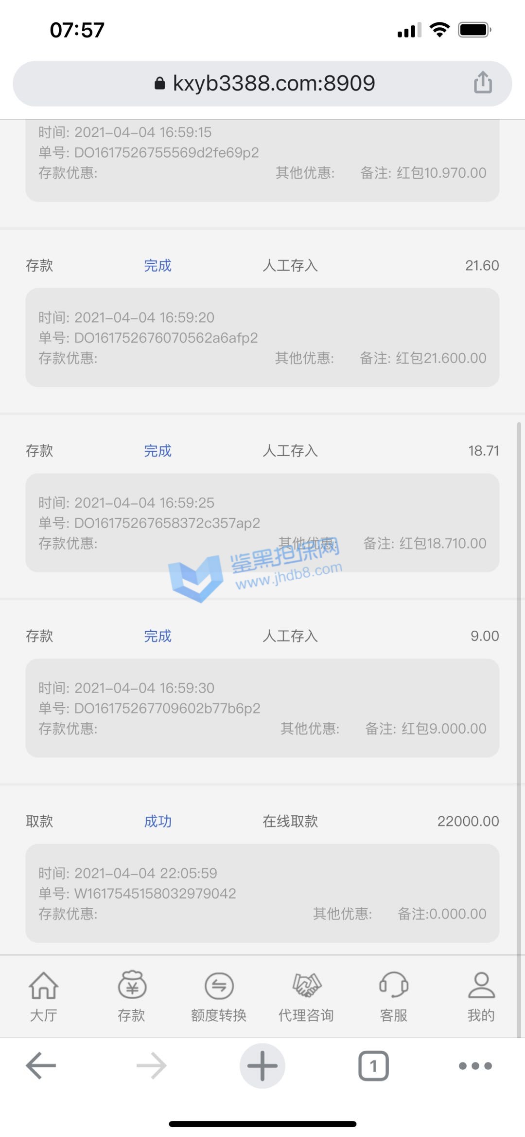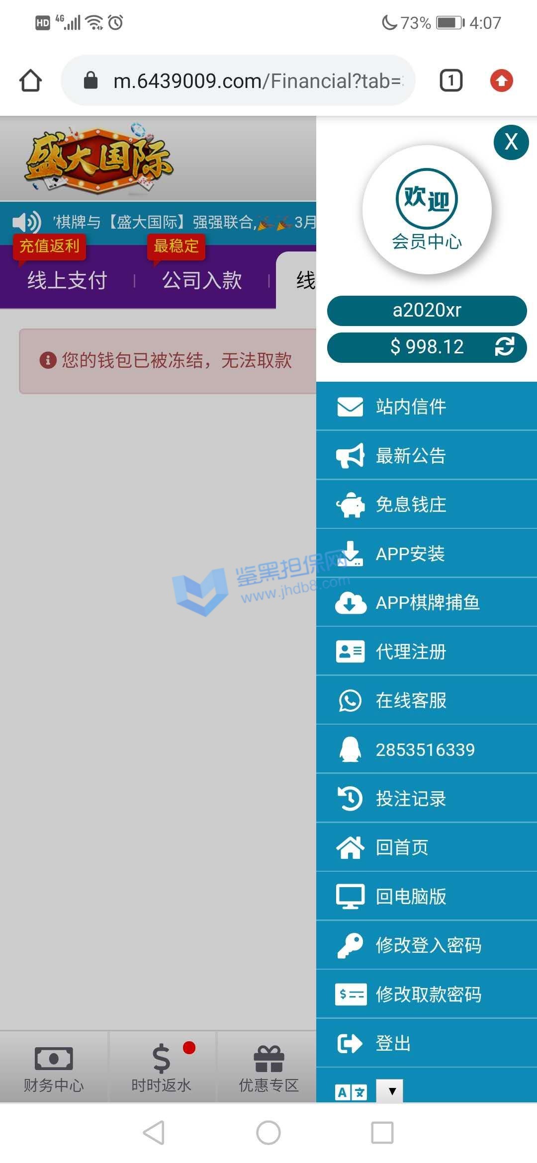 我是个线下低频彩庄家,主营线下福彩3D与体彩排列三的彩民投注,由于个人实力有限,每天会将一部分彩民投注打到盘上,本人保证所有注单都是真实彩民投注! 很早就有这家台子客服的微信,但没有尝试过投注,今年春节前,他家客服联系我,想合作,当时我明确表示低频彩由于玩法杂乱流水低赚钱慢,是一种在网上不受待见的彩种,但对方表示没关系,只要彩票站能买的,他那里都可以投注,于是就拿出了一部分投注到开心100了,也就发生了后面的不愉快! 4月4日晚,我正常投注,开奖后提款,很快就显示提款成功,但直到第二天都没有到账,客服以三方延迟为借口推脱,还诱骗我继续充值,但我没有继续上当,后来经过交涉,客服承认黑我钱,因为我赢了,他要降低损失,一共黑了我73360并注销了我的账号,希望大家擦亮眼睛,不要被这种黑台子诱惑,说的再多保障都没用,真黑你时候,你是找不到人的!另外要说明的是,由于低频彩封盘与投注时间非常紧张,所以本人经过与客服协商并得到他同意后申请了两个账号进行投注,不然忙不过来,每天我投注官方玩法,我员工投注传统彩玩法,绝非同平台对打套利,所有投注项目全部提前与客服协商过并得到了他的同意!恳请平台帮忙维权!