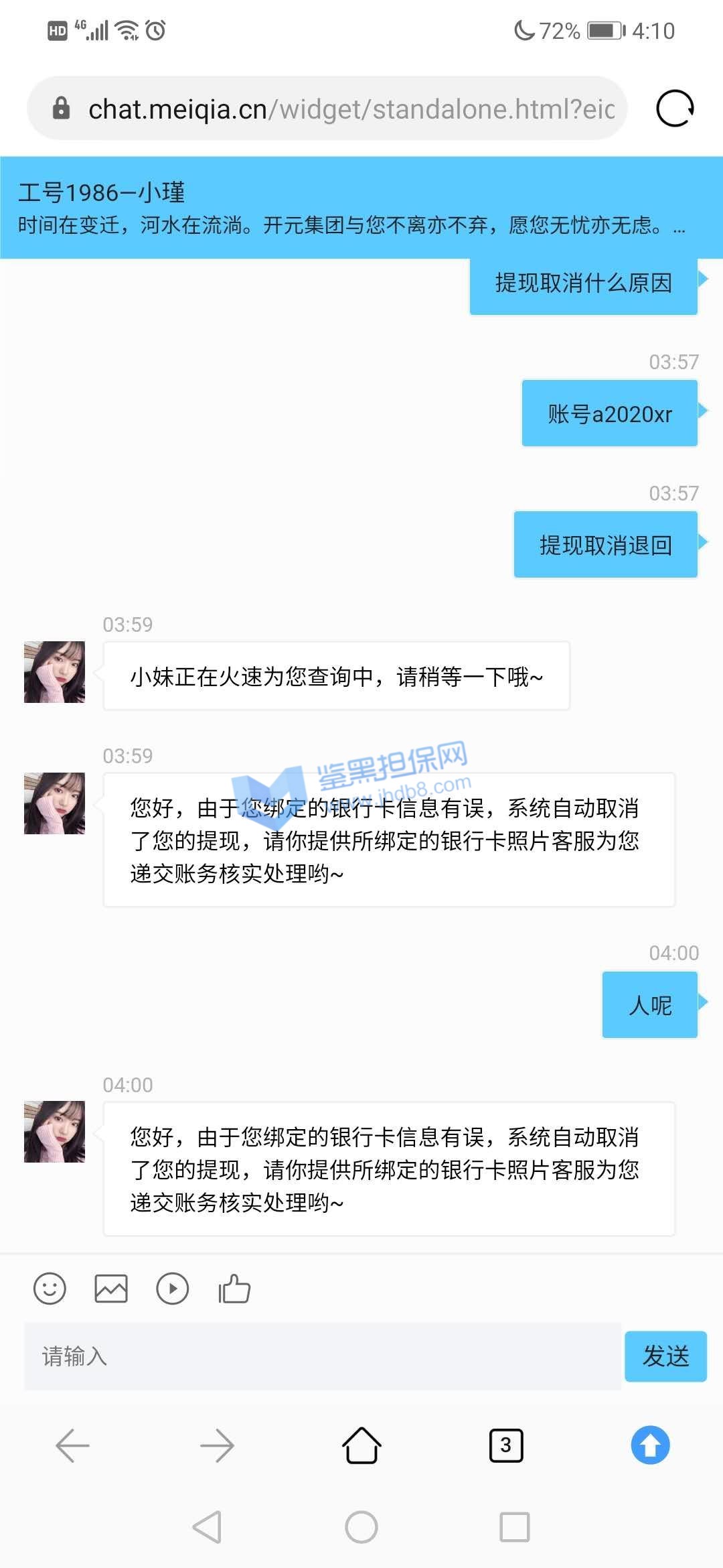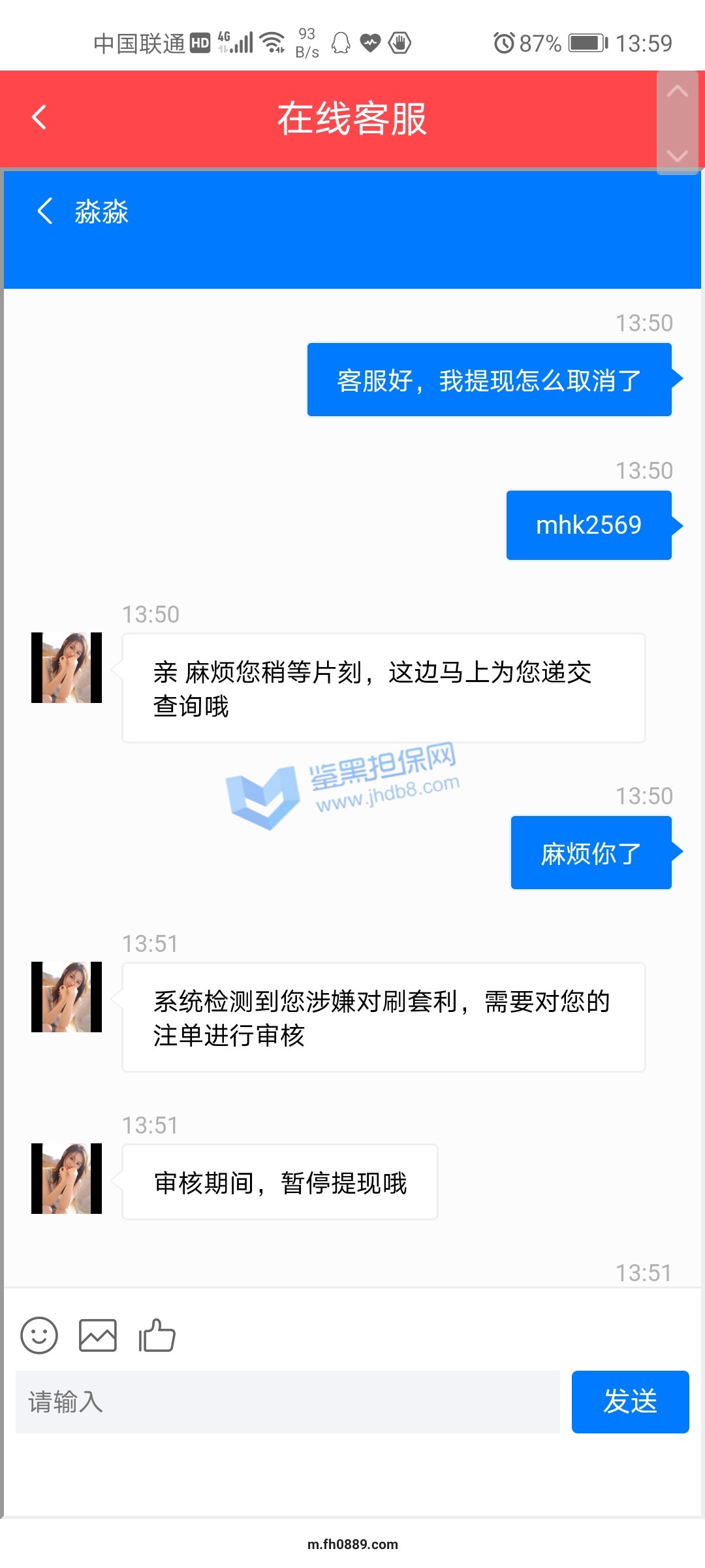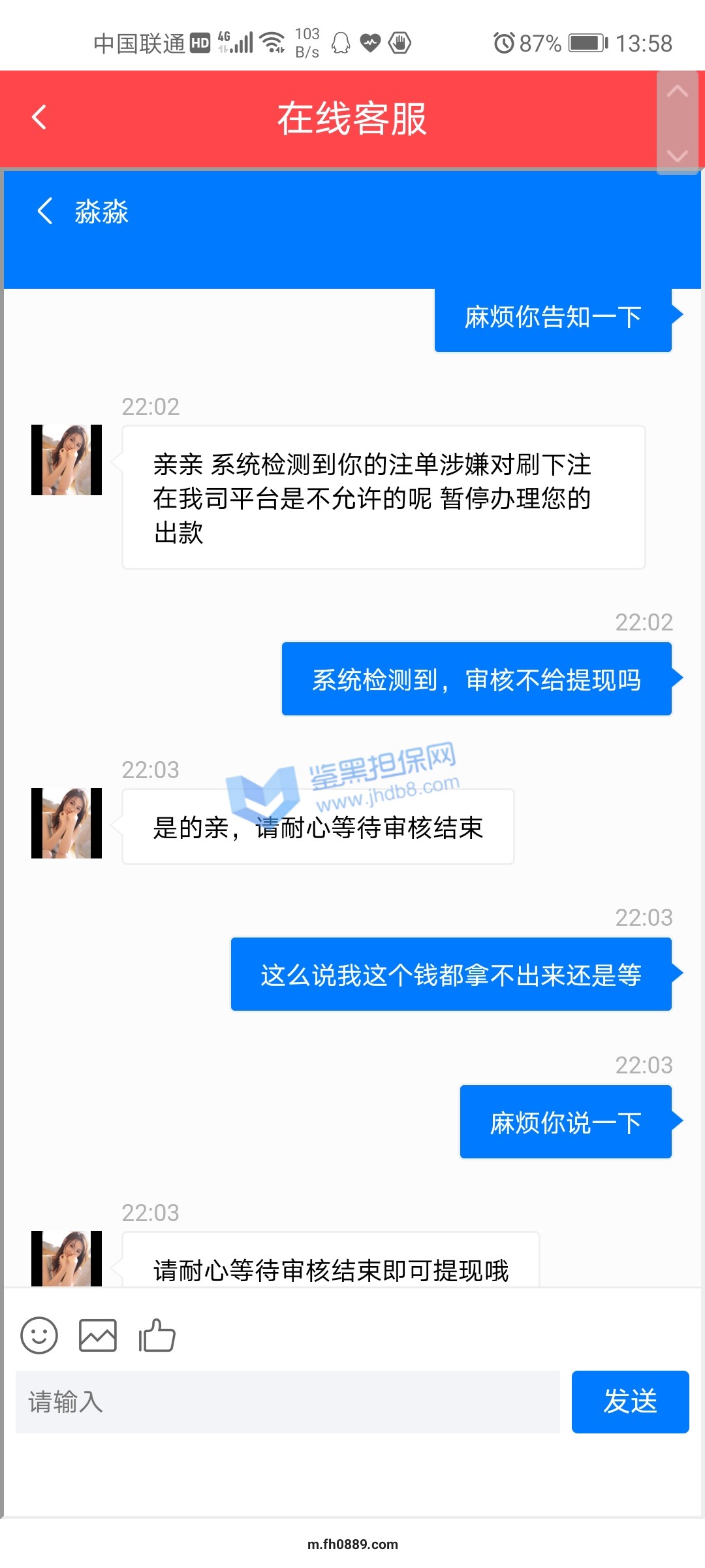 4.用户提交维权需为本人提交,若代替让人发布维权鉴黑担保网将拒绝受理;