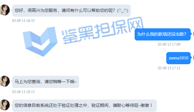 3,鉴黑担保网维权专员联系该平台相关负责人核实情况,对方告知会在3/16之前完成审核,当该会员再次反馈提款还在审核状态并未结束时,维权专员再次联系该平台,这次得到的回复是还在审核当中,无法提供审核结束时间,拒绝更多沟通,随后封闭对话沟通渠道!!