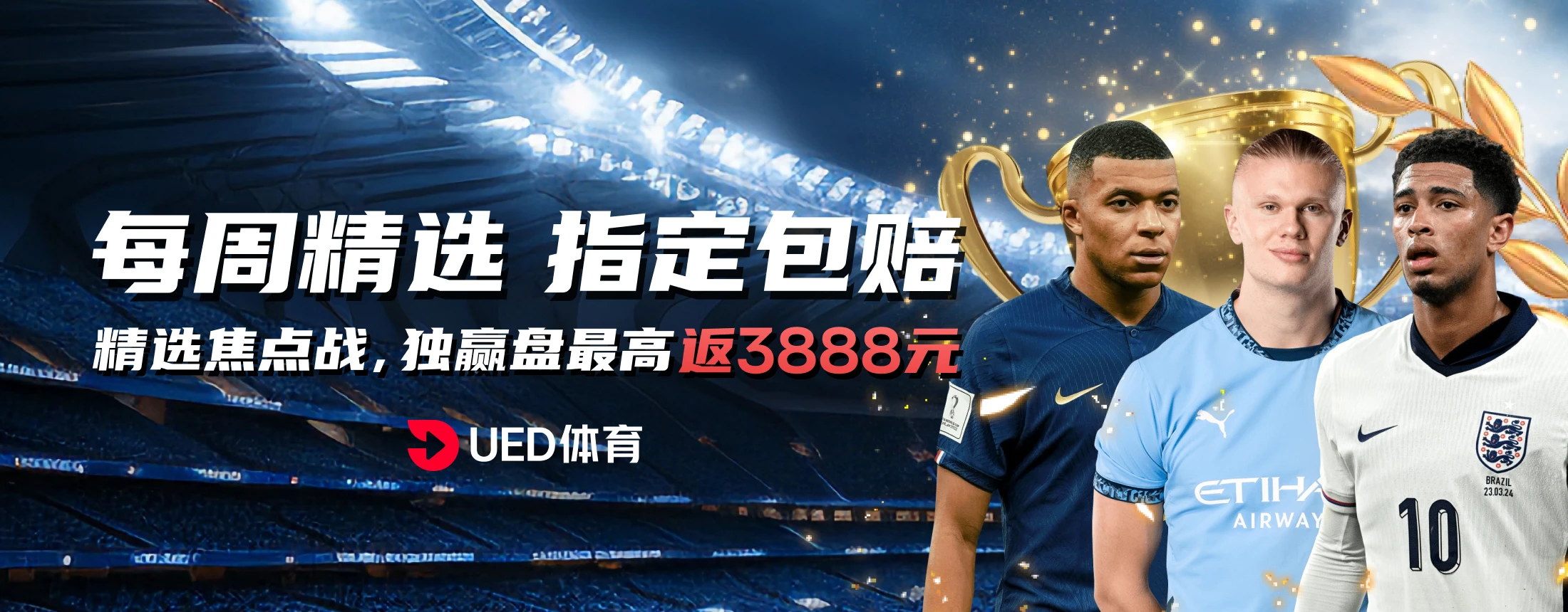 凡赛事期间,UED体育将每周提供指定赛事,仅在【全场独赢】盘口下注,单笔下注金额达到活动要求,即可向客服申请领取对应包赔彩金,最高包赔3888