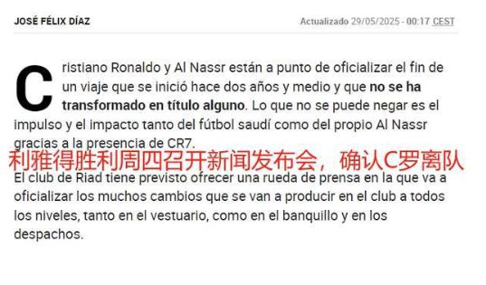 《马卡报》透露,本周四,利雅得胜利将召开新闻发布会上,宣布俱乐部一些重要事宜,包括管理层任免、球员去留,更重要的是,俱乐部将确认C罗离队。