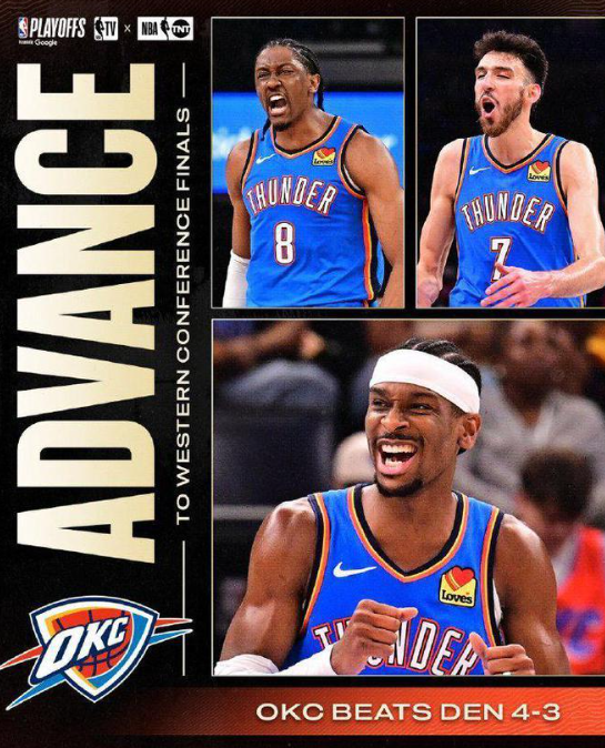 北京时间5月19日,NBA季后赛继续进行,俄克拉荷马城雷霆队赢下抢七晋级西部决赛。亚历山大得到35分,威廉姆斯得到24分、5个篮板和7次助攻,他们率队依靠后三节攻势确立大比分领先,雷霆队在西部半决赛第7场以125-93战胜丹佛掘金队。雷霆队以4-3险胜掘金队晋级,他们将与明尼苏达森林狼队争夺西部冠军。